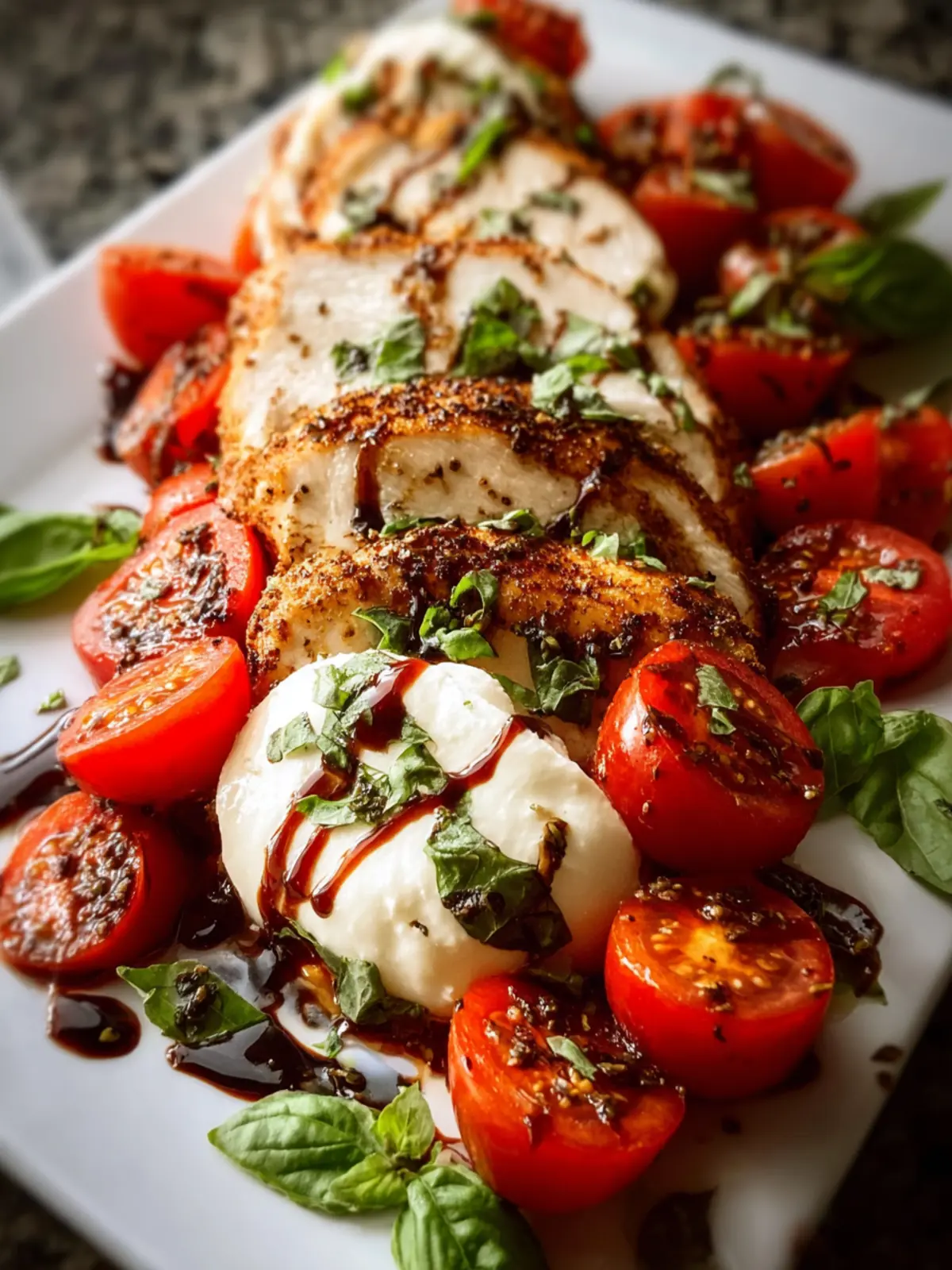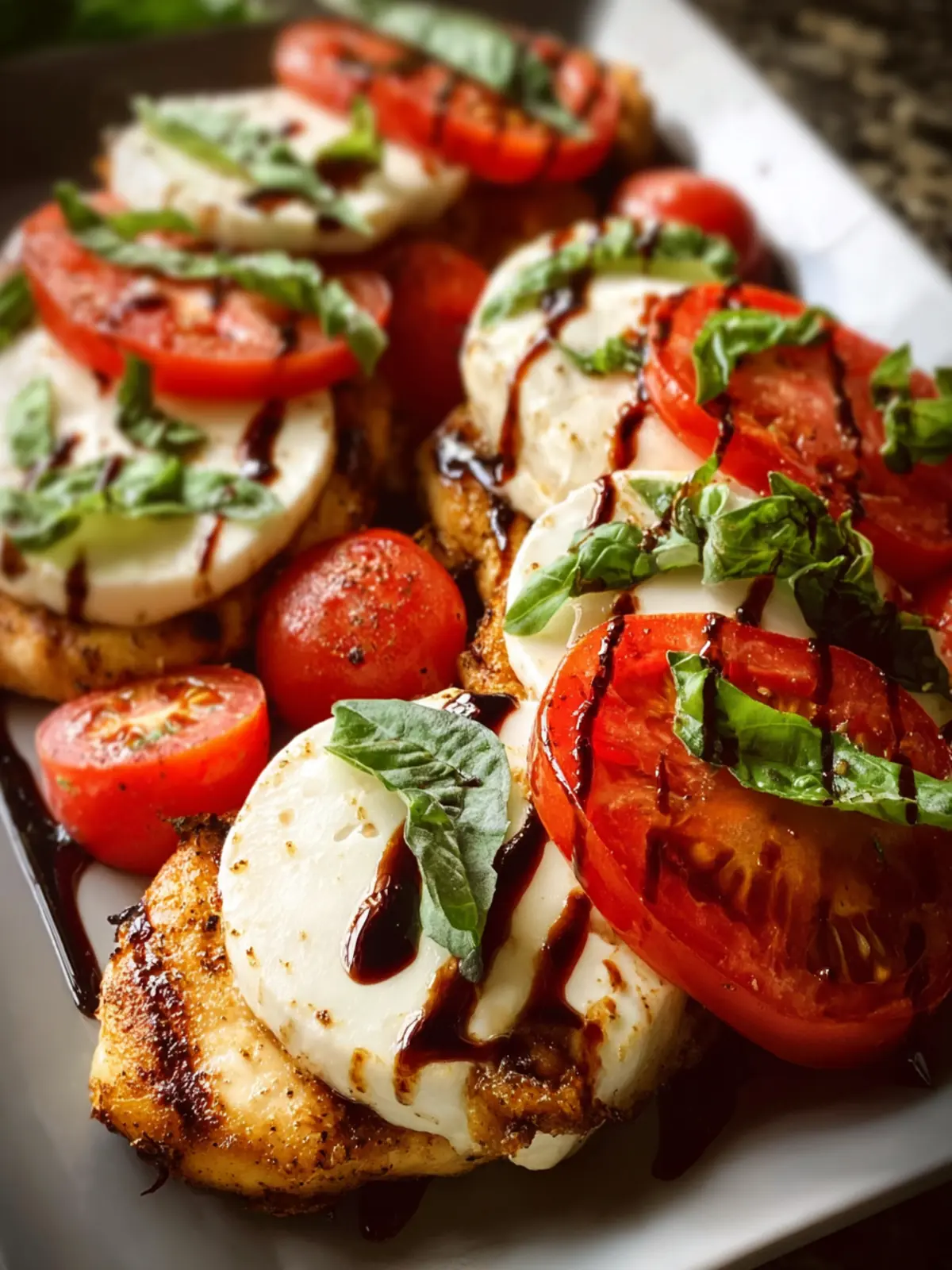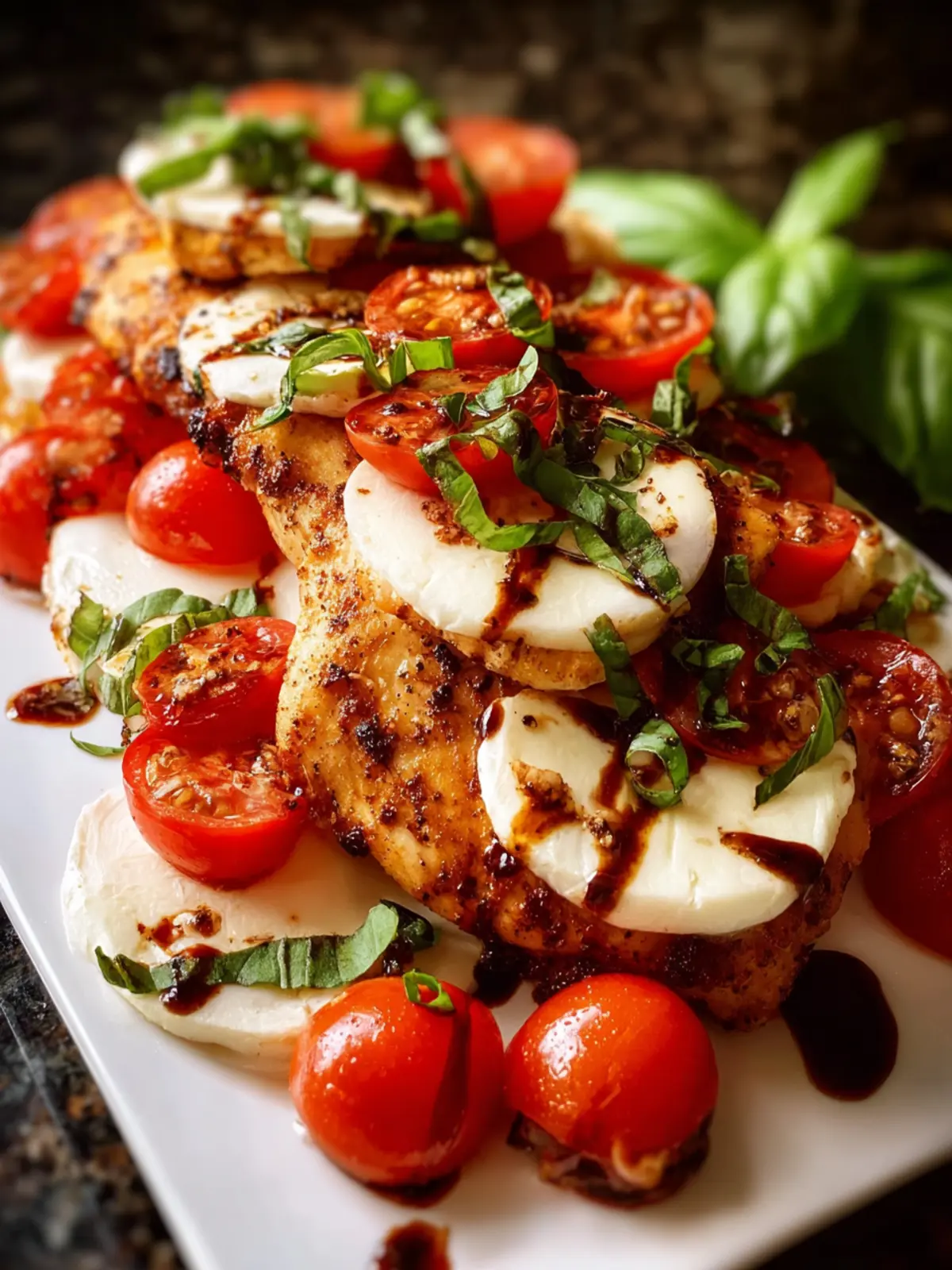 A delicious dish featuring seared chicken breasts topped with fresh tomatoes, mozzarella, and basil, drizzled with balsamic glaze.