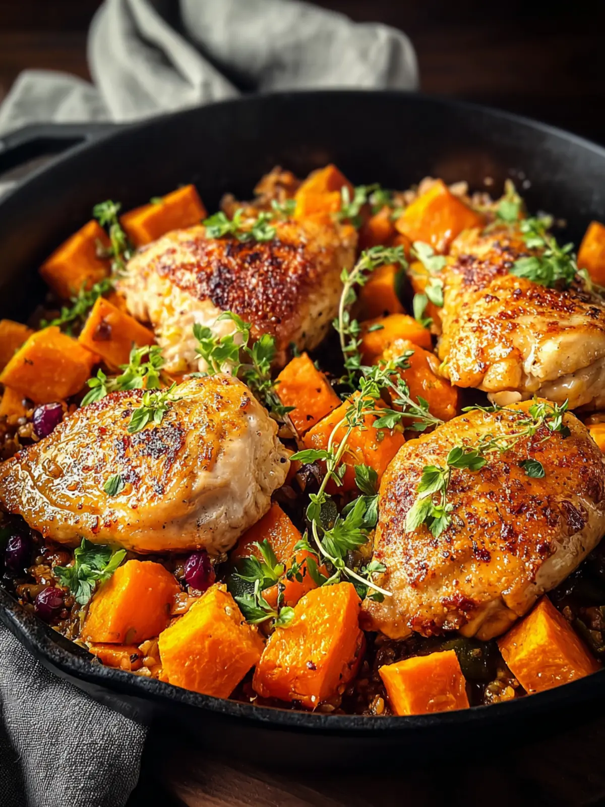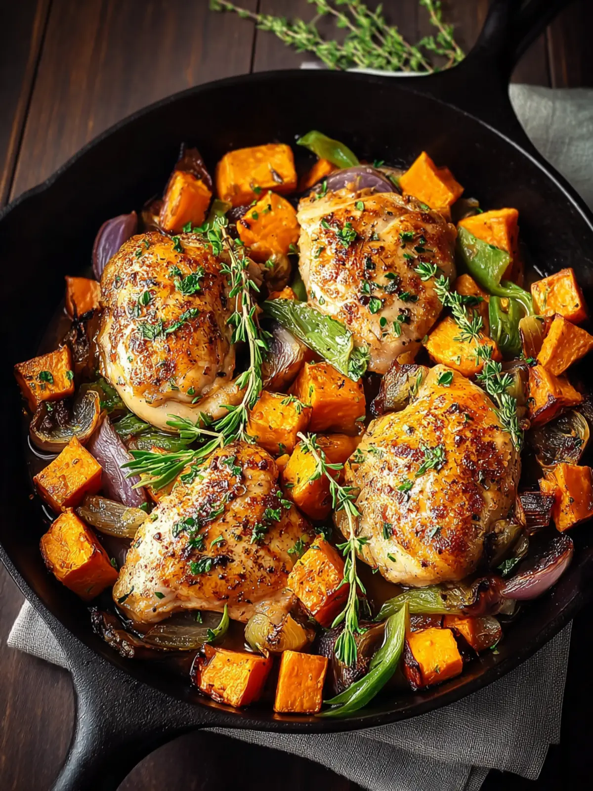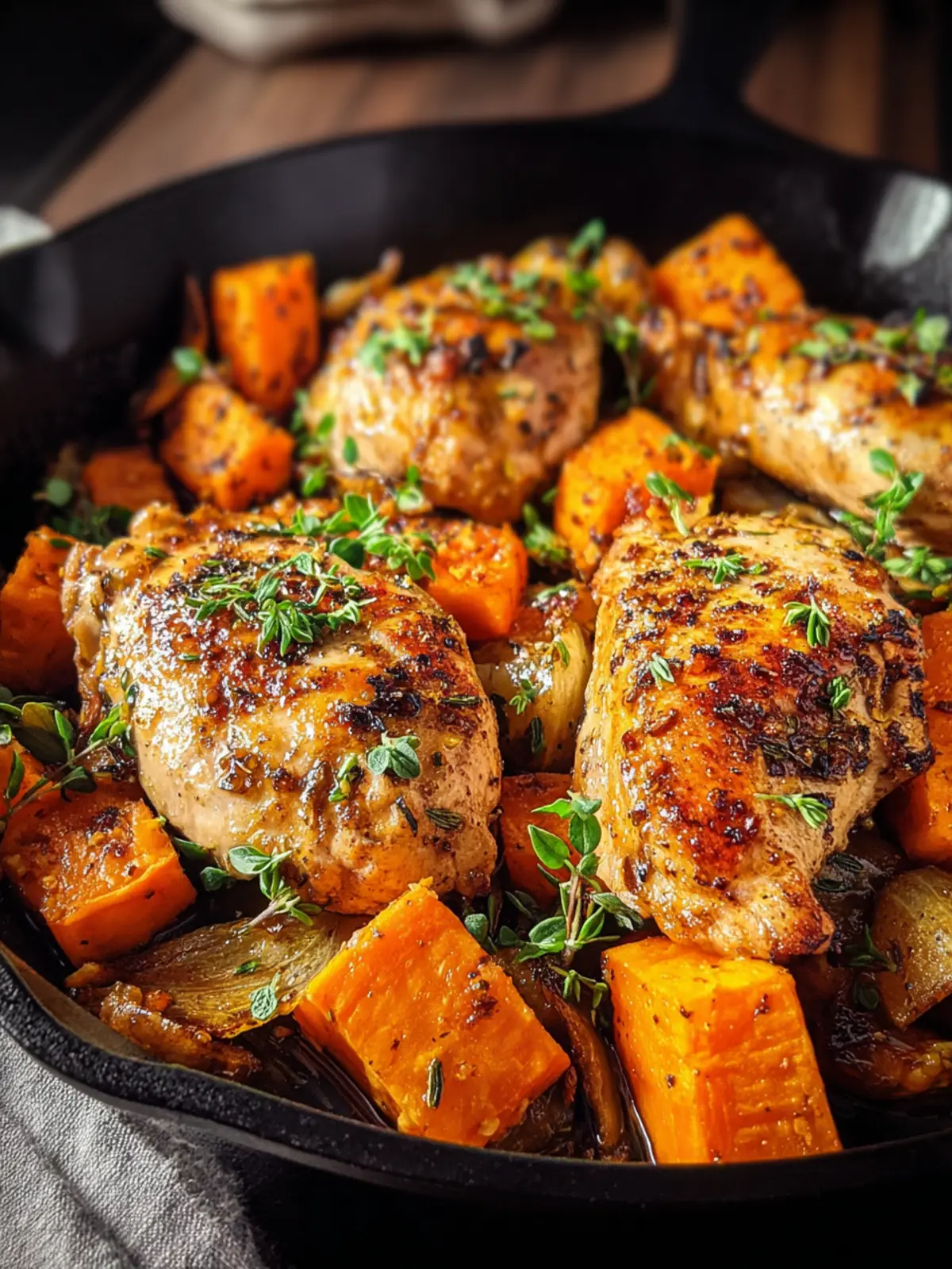A delicious and hearty dish featuring sautéed chicken thighs with sweet potatoes and aromatic herbs.