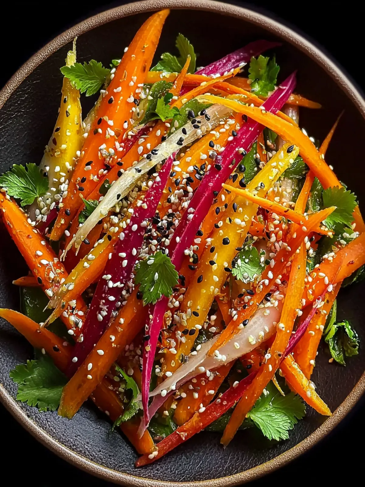 A vibrant and refreshing salad made with rainbow carrots and a delicious sesame dressing.
