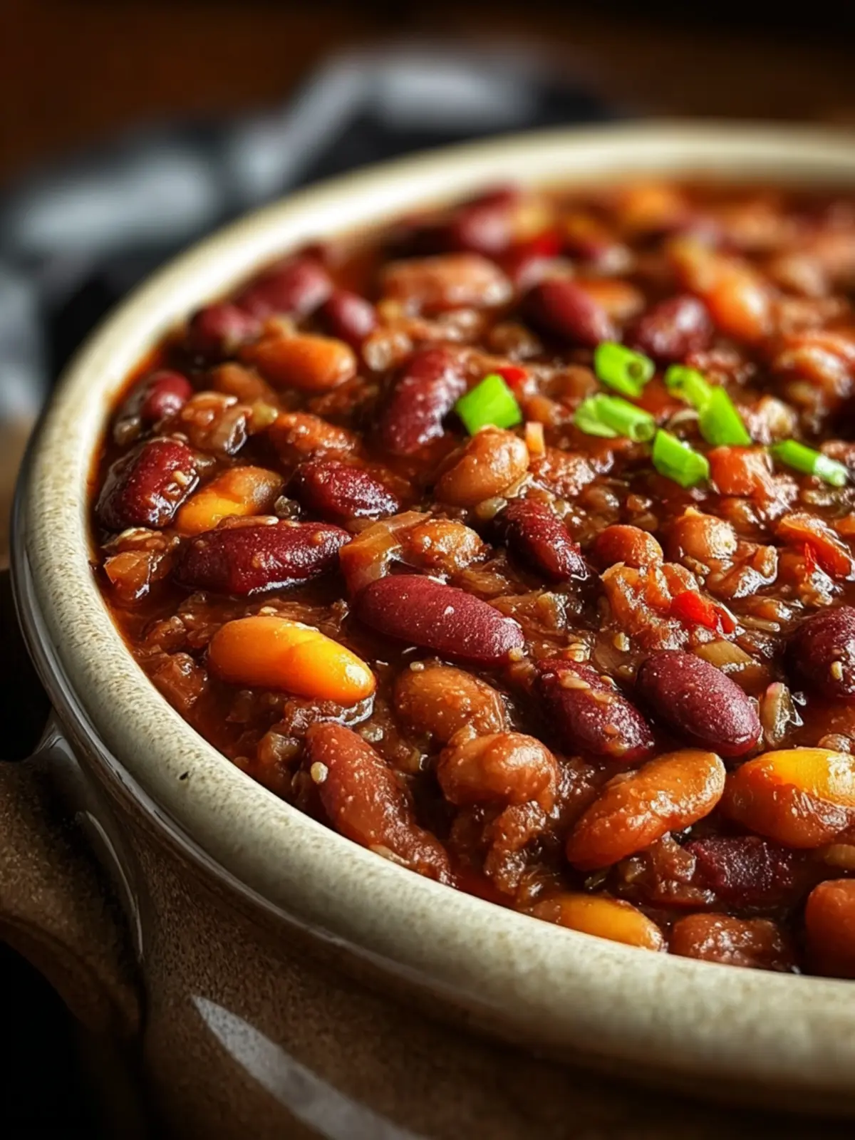 A delicious slow cooker recipe combining ground beef, smoked sausage, and a variety of beans in a tangy barbecue sauce.